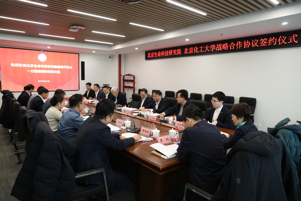 1月14日下午,中国工程院院士、国家烟草专卖局首席科学家谢剑平,北京生命科技研究院党委书记、总经理王德平一行到我校朝阳校区开展战略合作签约。校长、中国工程院院士谭天伟出席并讲话,党委常委、副校长王峰主持签约仪式。